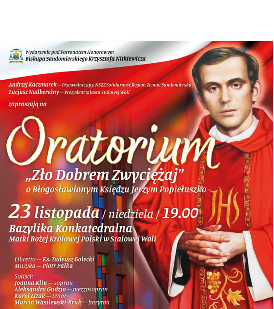 W Stalowej Woli wykonane zostanie oratorium „Zło Dobrem Zwyciężaj”. Jest to koncert ku pamięci błogosławionego księdza Jerzego Popiełuszki i jednocześnie premiera tego wyjątkowego dzieła.