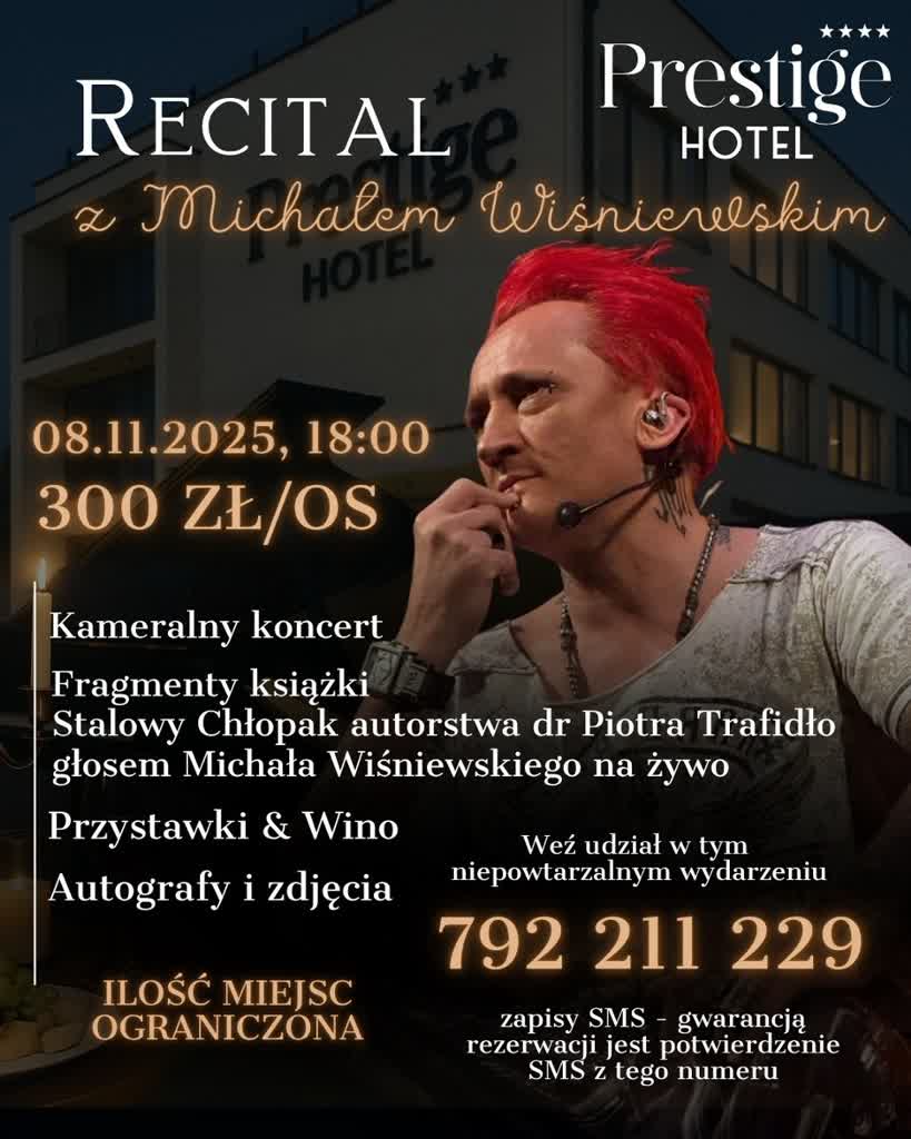 Recital odbędzie się w najbliższą sobotę (8 listopada) w restauracji „Prestige Hotel” o godzinie 18 00. Michał Wiśniewski będzie także czytał fragmenty książki „Stalowy chłopak” autorstwa Piotra Trafidło. Po występie każdy z gości będzie miał okazję spotkać się z Michałem Wiśniewskim, zrobić wspólne zdjęcie i otrzymać autograf.