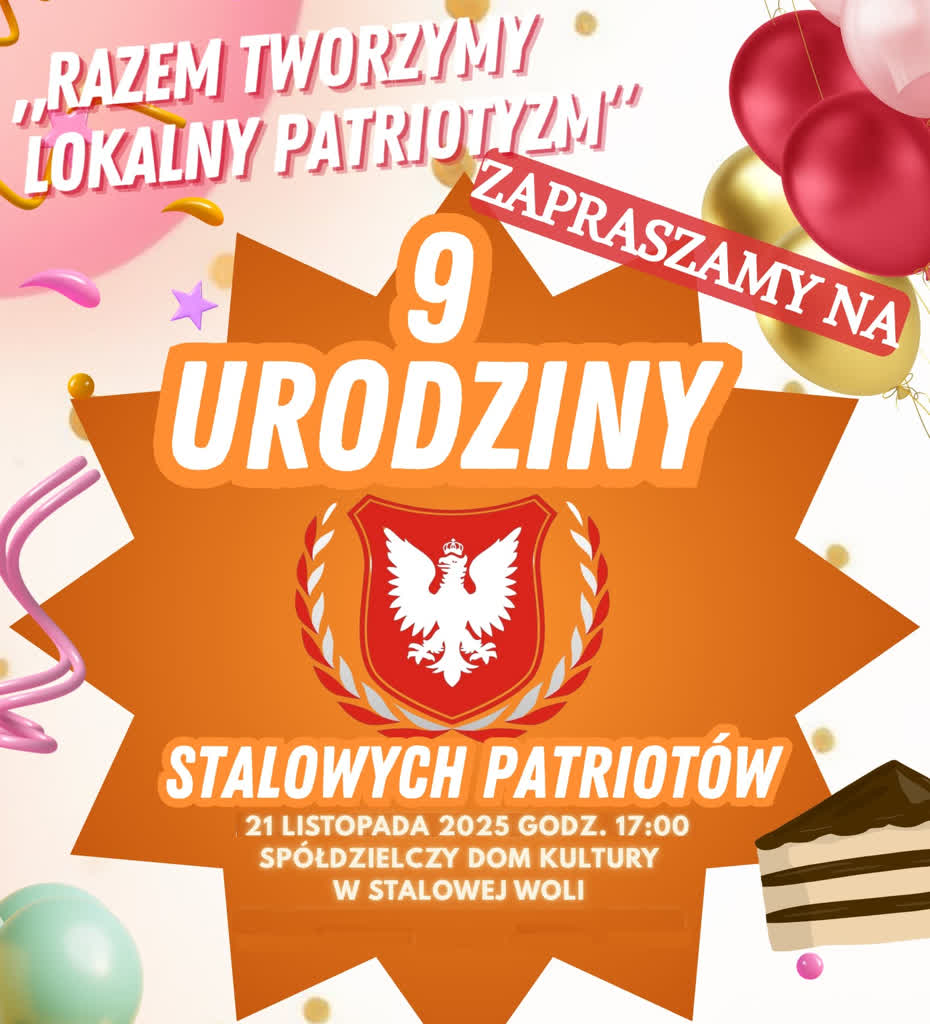 Stowarzyszenie Stalowi Patrioci w Stalowej Woli ma już 9 lat. Z tej okazji organizuje spotkanie urodzinowe i uroczystość w Spółdzielczym Domu Kultury, na którą zaprosiło mieszkańców.