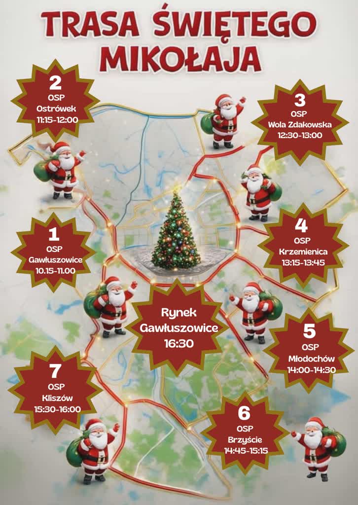 Przystanki św. Mikołaja to: Gawłuszowice, Ostrówek, Wola Zdakowska, Krzemienica, Młodochów, Brzyście, Kliszów oraz Rynek Gawłuszowice. Właśnie na rynek wjechała już najpiękniejsza choinka w okolicy, która rozbłyśnie tysiącem świateł 7 grudnia o 16:30.