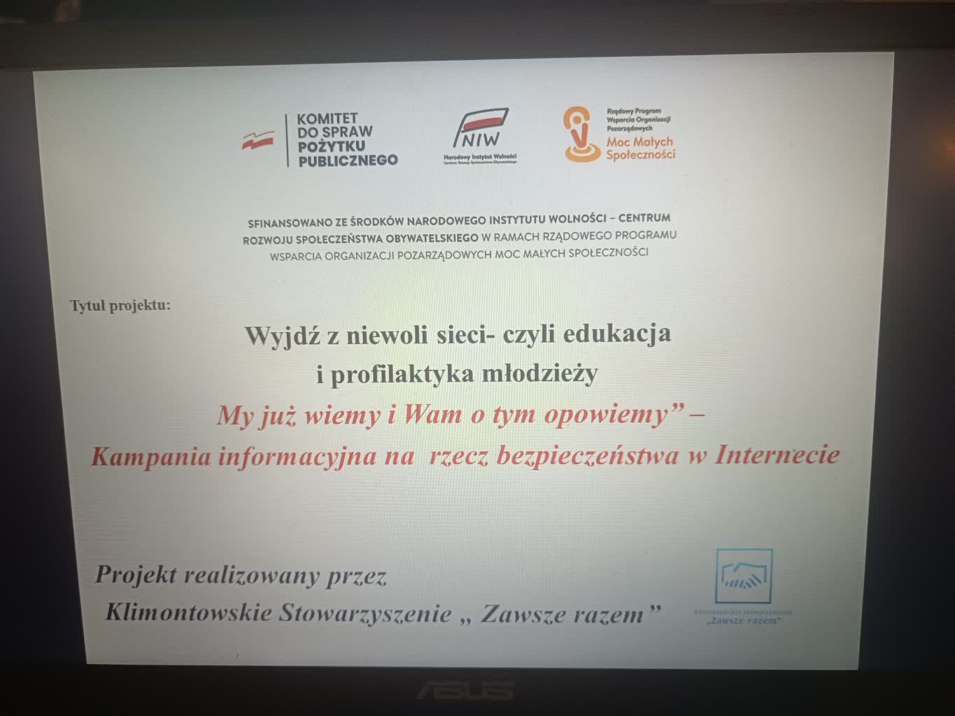 Klimontowskie Stowarzyszenie „Zawsze razem” jest jedną z 46 organizacji z województwa świętokrzyskiego, która otrzymała dotację z Narodowego Instytutu Wolności Centrum Rozwoju Społeczeństwa Obywatelskiego na realizację projektu „Wyjdź z niewoli sieci – czyli edukacja i profilaktyka młodzieży”, w ramach Programu MOC MAŁYCH SPOŁECZNOŚCI, Priorytet 1: Odporne, zintegrowane społeczności lokalne.