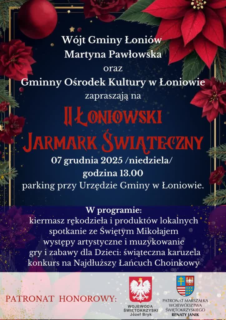 Już w najbliższą niedzielę odbędzie się jarmark świąteczny w Łoniowie. Start 7 grudnia o godzinie 13:00. W programie kiermasz rękodzieła, spotkanie ze świętym Mikołajem, wystepy artystyvzne, muzykowanie i konkurs na najdluższy łańcuch choinkowy. Wydarzenie organizują wójt Martyna Pawłowska oraz Gminny Ośrodek Kultury w Łoniowie.