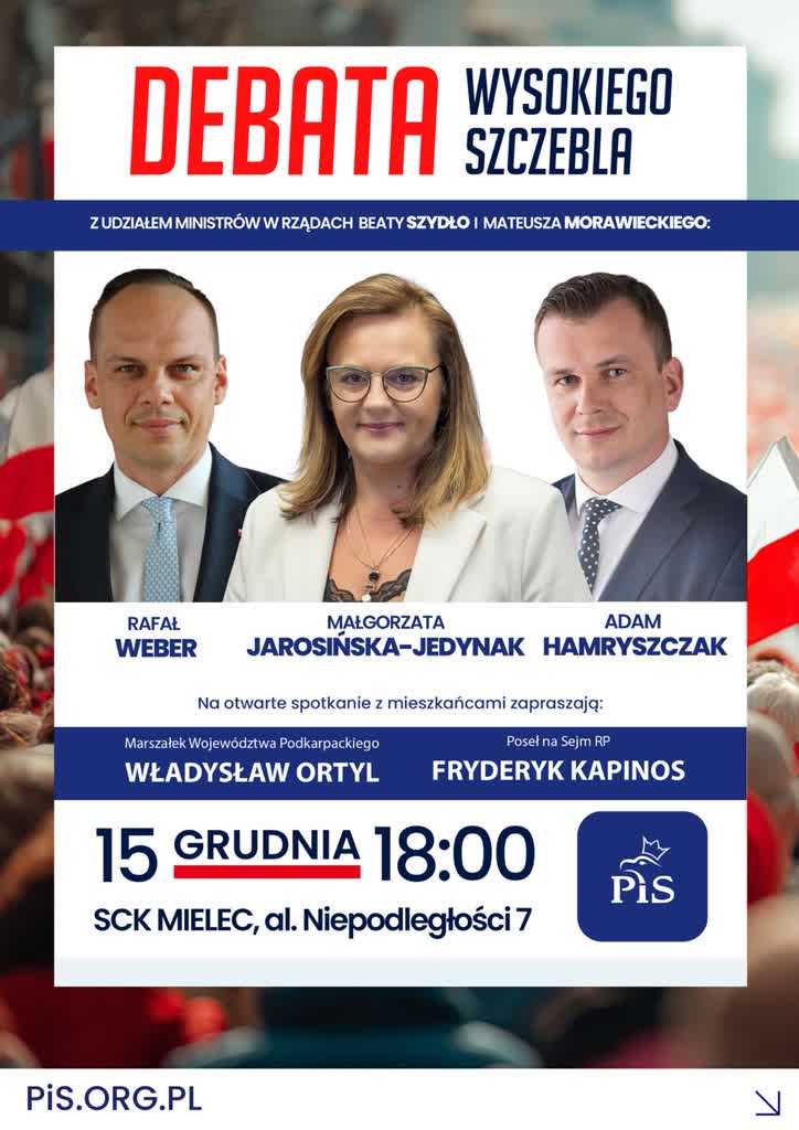 W Mielcu odbędzie się otwarte spotkanie pod hasłem „Debata wysokiego szczebla z ministrami w rządach Beaty Szydło i Mateusza Morawieckiego – Małgorzatą Jarosińską – Jedynak, Rafałem Weberem, Adamem Hamryszczakiem. Tematem spotkania będzie „Rozwój Obszarów Przemysłowych. Bezpieczeństwo mieszkańców.” Wydarzenie odbędzie się 15 grudnia (tj. poniedziałek) o godz. 18:00 w Domu Kultury SCK Mielec, al. Niepodległości 7, sala nr 1.