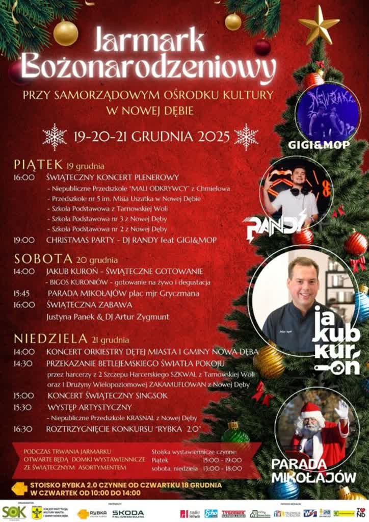 Już w najbliższy piątek, 19 grudnia w Nowej Dębie odbędzie się Jarmark Bożonarodzeniowy organizowany przy Samorządowym Ośrodku Kultury. Trzydniowe wydarzenie łączy świąteczną atmosferę z bogatym programem artystycznym i kulinarnym.