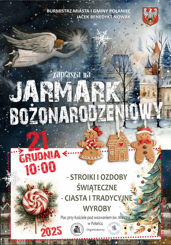 21 grudnia od godziny 10.00 plac przy Kościele pw. św. Marcina w Połańcu stanie się miejscem przedświątecznego spotkania mieszkańców i gości. Tego dnia odbędzie się Jarmark Bożonarodzeniowy, na który zaprasza Burmistrz Miasta i Gminy Połaniec, Jacek Benedykt Nowak.
