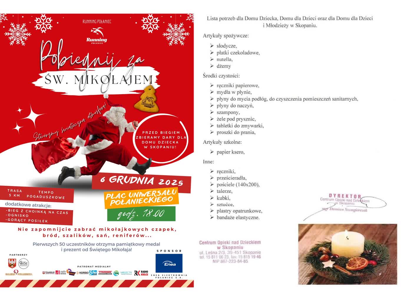 Pierwszych 50 uczestników otrzyma pamiątkowy medal i prezent od Świętego Mikołaja. Początek biegu o godzinie 18. Wydarzenie ma jeszcze jeden aspekt. Organizatorzy pomagają Domowi Dziecka w Skopaniu. 2 i 4 grudnia w Galerii Połanieckiej w godzinach od godziny 17 prowadzona będzie zbiórka artykułów spożywczych, środków czystości, artykułów szkolnych a także pościeli, talerzy czy środków opatrunkowych. Zebrane dary zostaną przekazane przedstawicielom placówki podczas biegu.