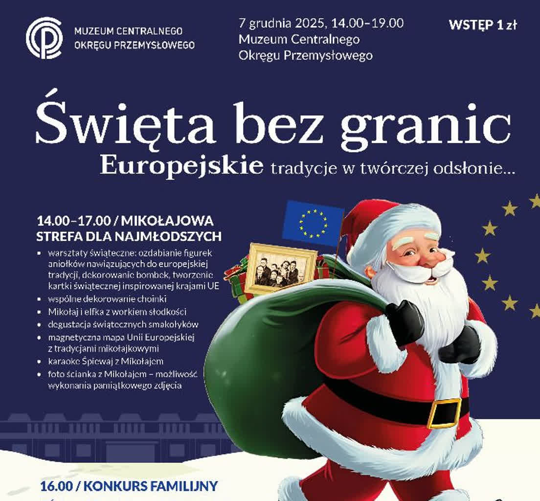 Wyjątkowe mikołajki i świąteczna atmosfera czekają tych, którzy w niedzielę popołudniu pojawią się w Muzeum COP w Stalowej Woli. Od godziny 14.00 w ramach wydarzenia to wydarzenie ŚWIĘTA BEZ GRANIC– europejskie tradycje w twórczej odsłonie nie braknie licznych atrakcji. Będą warsztaty świąteczne, koncert piosenek świątecznych, mikołajkowy quizspotter, opowieści o przedwojennej Wigilii, a nawet wizyta Mikołaja z prezentami.
