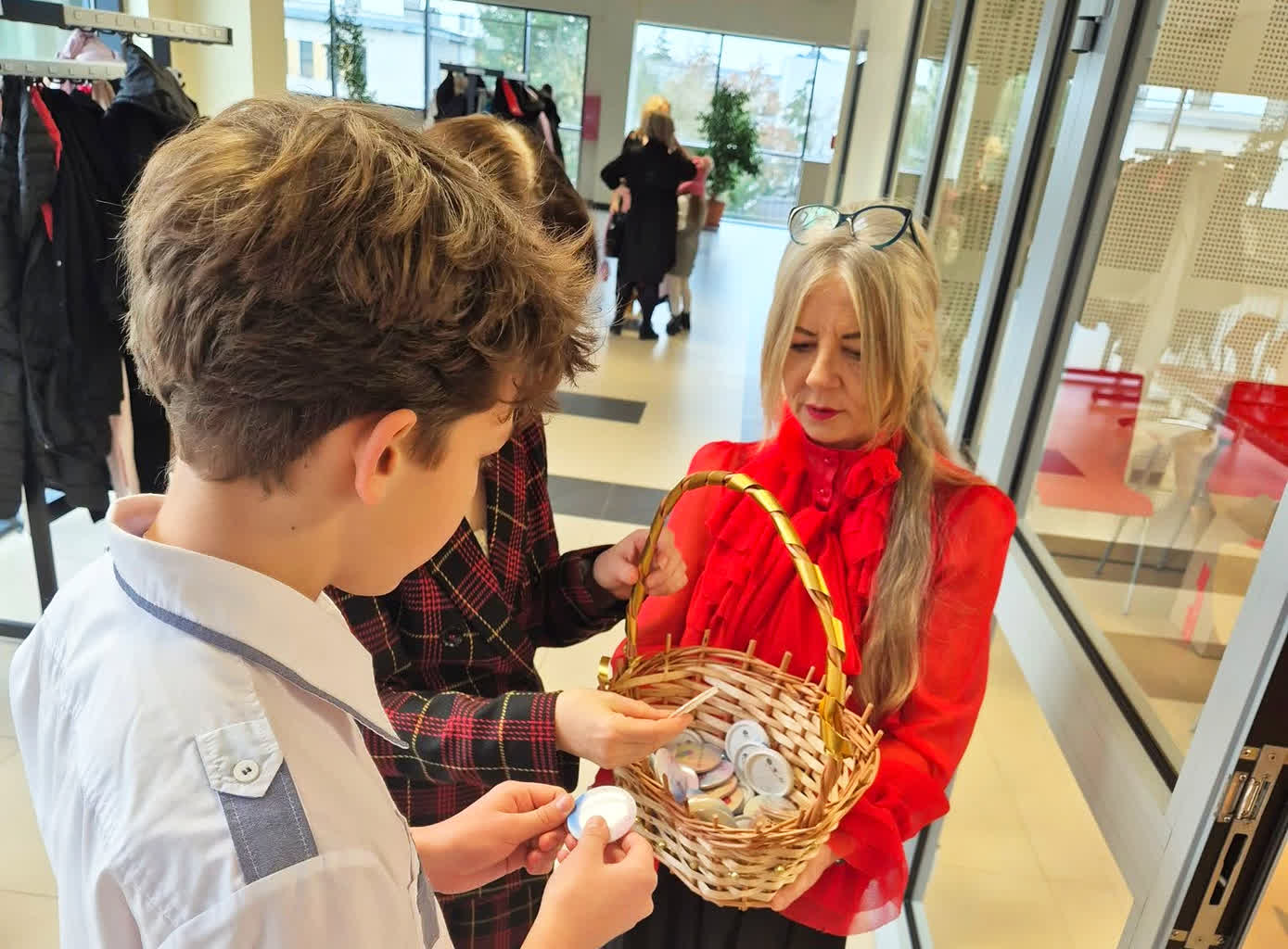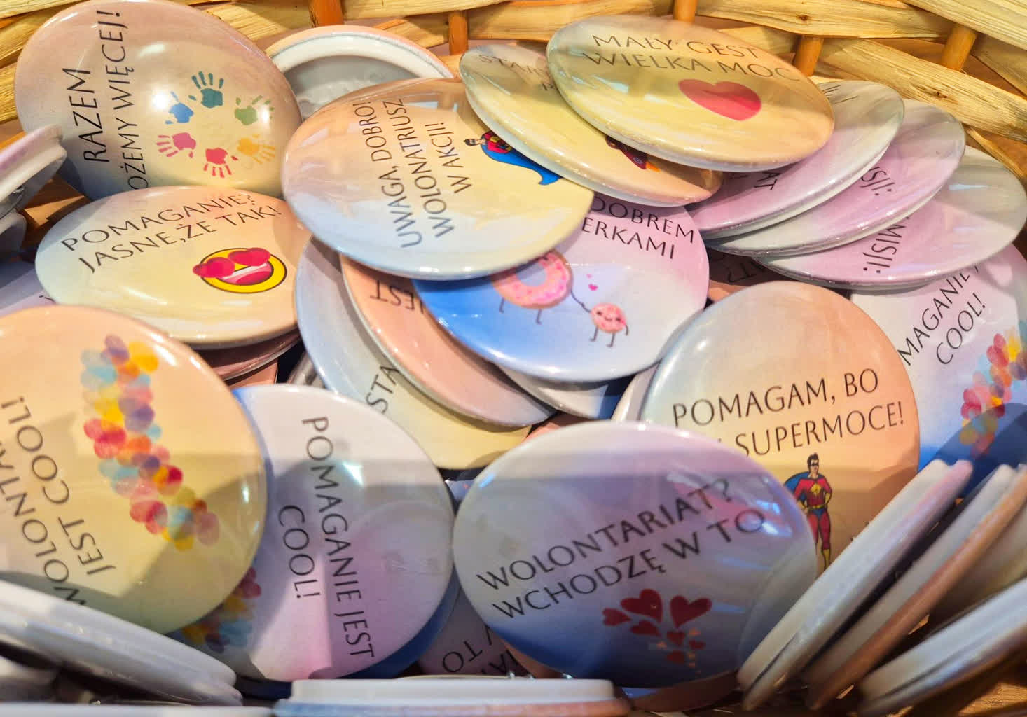 Symbolicznym podziękowaniem były rozdawane plakietki z hasłami dającym supermoce wolontariuszom.
