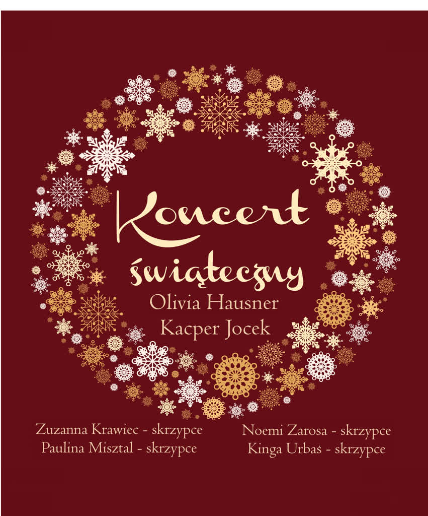 W wyjątkowym, pełnym ciepła i muzycznych wzruszeń repertuarze świątecznym wystąpią :Olivia Hausner i Kacper Jocek. Instrumentalnie ubarwią koncert skrzypaczki Zuzanna Krawiec, Paulina Misztal, Noemi Zarośla i Kinga Urbaś oraz pianista Dominik Boś.