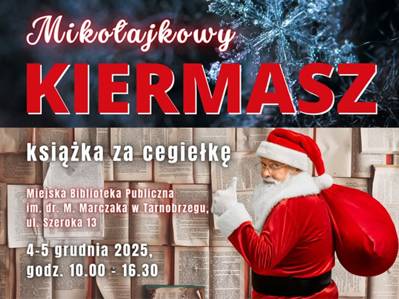 Na mikołajkowy kiermasz „Książka za cegiełkę” zaprasza Miejska Biblioteka Publiczna w Tarnobrzegu. Wydarzenie odbędzie się w dniach 4 5 grudnia w godzinach od 10:00 do 16.30.