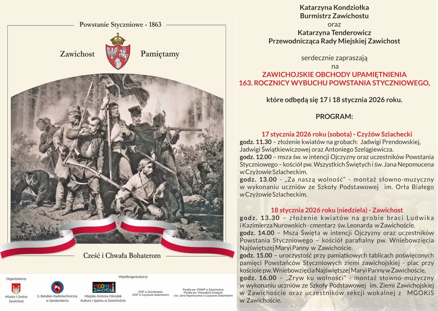 Dalsza część obchodów będzie miała miejsce w niedzielę (18 stycznia) w Zawichoście w oprawie wojskowej. O 13.30 złożenie kwiatów na grobie braci Ludwika i Kazimierza Nurowskich na cmentarzu św. Leonarda. O 14.00 Msza Święta w intencji ojczyzny oraz uczestników powstania styczniowego w kościele Wniebowzięcia Najświętszej Maryi Panny, po mszy uroczystości przy pomniku pamięci powstańców styczniowych, zaś o godz. 16.00 montaż słowno-muzyczny „Zryw ku wolności” w wykonaniu uczniów ze Szkoły Podstawowej w Zawichoście oraz uczestników sekcji wokalnej Miejsko-Gminnego Ośrodka Kultury i Sportu.