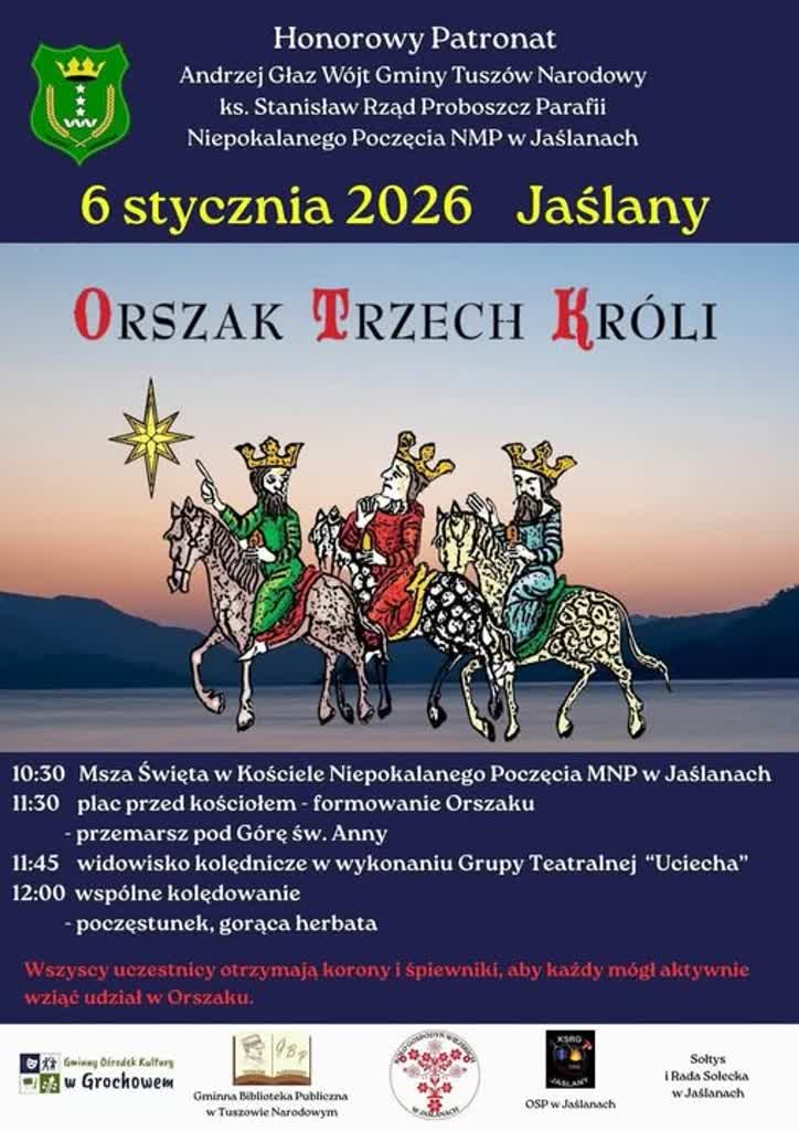 Orszak Trzech Króli to radosne i barwne wydarzenie, które łączy pokolenia i pozwala wspólnie przeżywać piękną tradycję Święta Objawienia Pańskiego. o 11.45 zaplanowano widowisko w wykonaniu grupy teatralnej „Uciecha”. W samo południe – wspólne kolędowanie z poczęstunkiem i herbatą. Organizatorzy zachęcają do przybycia całymi rodzinami, w strojach kolędników.