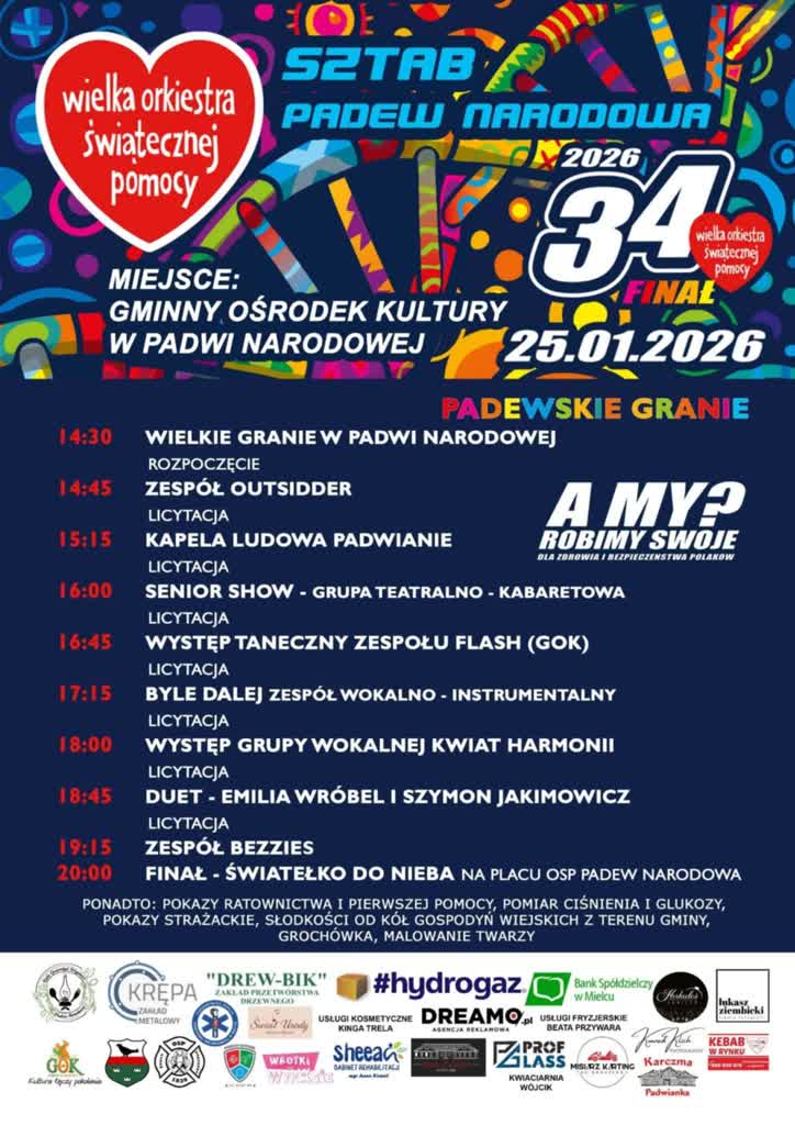 Rozpoczęcie WOŚP w Padwi Narodowej już od godz. 14.30 zaś na godz. 20.00 zaplanowane jest na placu OSP Światełko do Nieba. 34. Finał WOŚP, który w tym roku poświęcony jest wsparciu dzieci z chorobami przewodu pokarmowego.