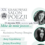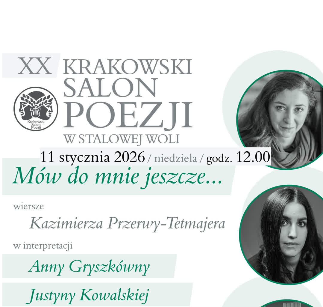 „Mów do mnie jeszcze…” – to tytuł kolejnego Krakowskiego Salonu Poezji, który już w tę niedzielę 11 stycznia w Stalowej Woli. Dwudziesta odsłona tych niezwykłych spotkań z poezją poświęcona jest twórczości Kazimierza Przerwy-Tetmajera, co ważne tradycyjnie w niezwykłym wykonaniu i oprawie muzycznej.