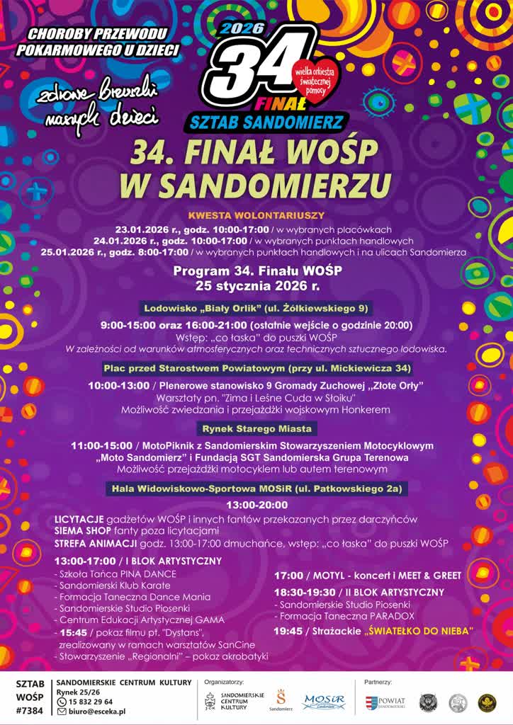 Po raz 34. w Sandomierzu odbędzie się Finał Wielkiej Orkiestry Świątecznej Pomocy. Wydarzenie rozpocznie się w niedzielę (25 stycznia) w hali MOSiR o godz. 13:00. Na uczestników czekają m.in.: tradycyjna kwesta wolontariuszy, których będzie można spotkać na ulicach Sandomierza, licytacje fantów i gadżetów WOŚP oraz symboliczne strażackie „Światełko do nieba”.
