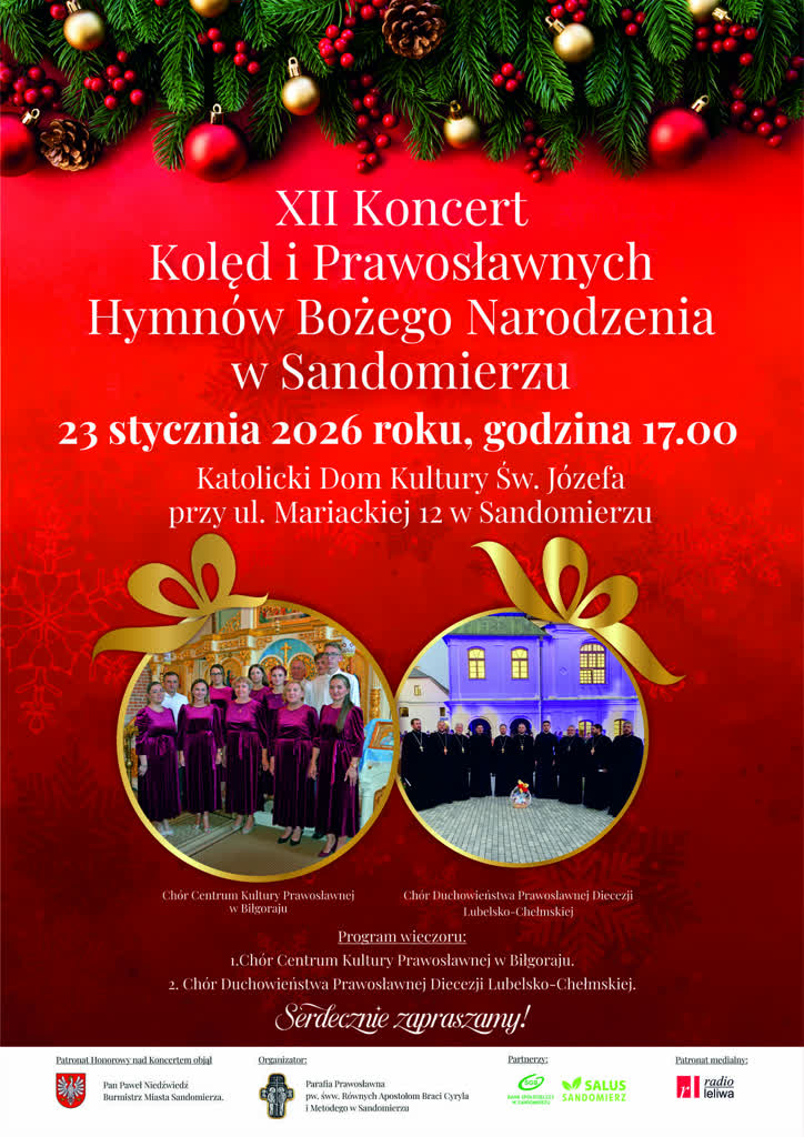 Parafia Prawosławna Świętych Równych Apostołom Braci Cyryla i Metodego w Sandomierzu po raz dwunasty organizuje Koncert Kolęd i Prawosławnych Hymnów Bożego Narodzenia. Wystąpią Chór Centrum Kultury Prawosławnej w Biłgoraju oraz Chór Duchowieństwa Prawosławnej Diecezji Lubelsko-Chełmskiej.