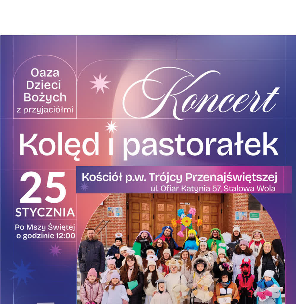 Mimo, że święta Bożego Narodzenia już za nami, to jeszcze w tę niedzielę w Stalowej Woli będzie można poczuć świąteczną atmosferę. A wszystko za sprawą a Koncertu Kolęd i Pastorałek, który odbędzie się w Kościele pw. Trójcy Przenajświętszej.