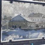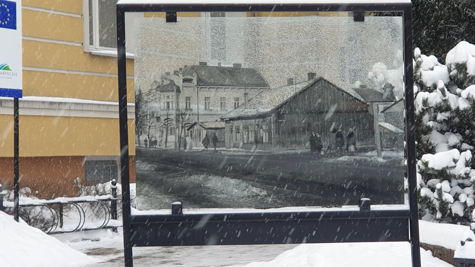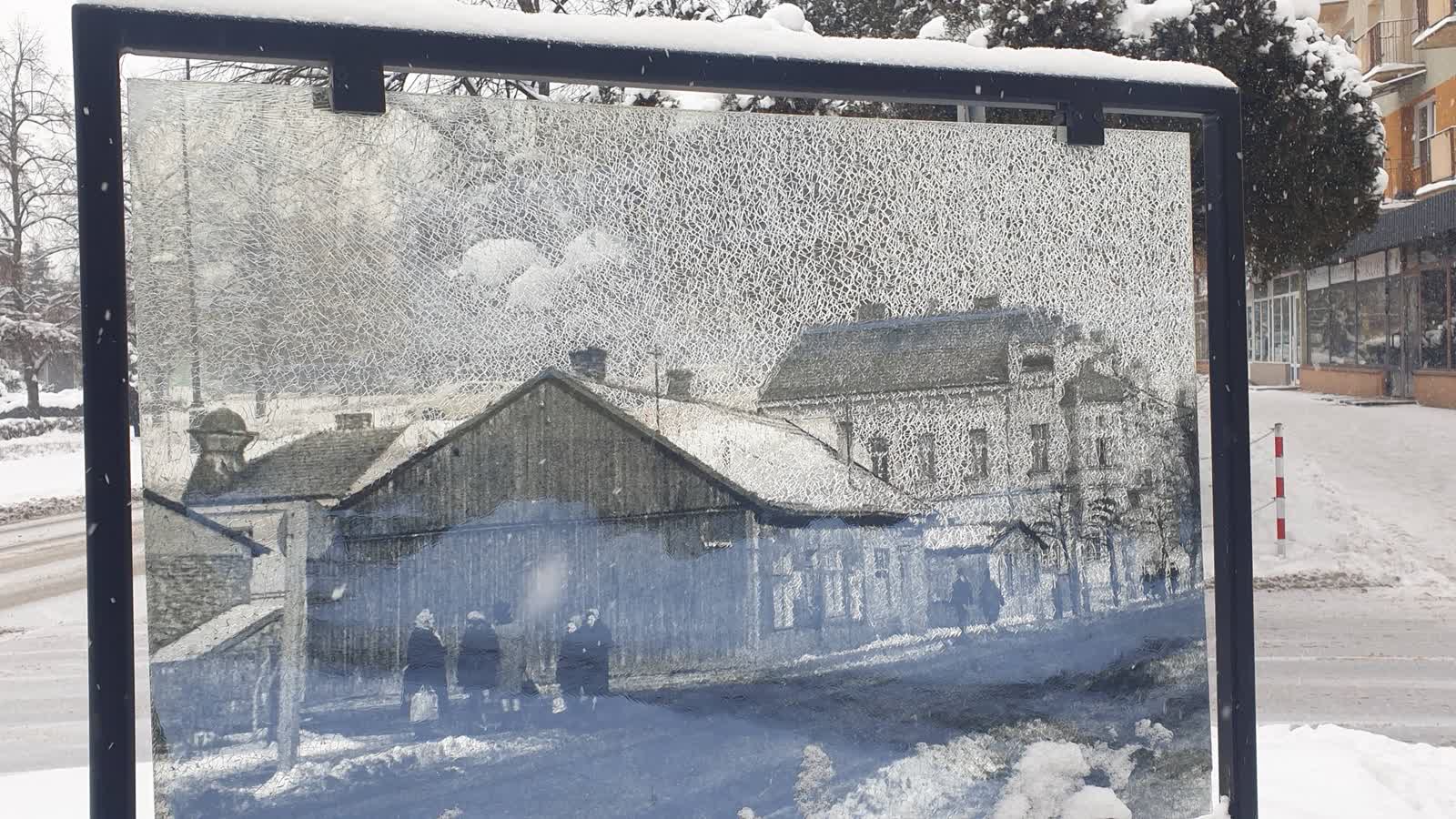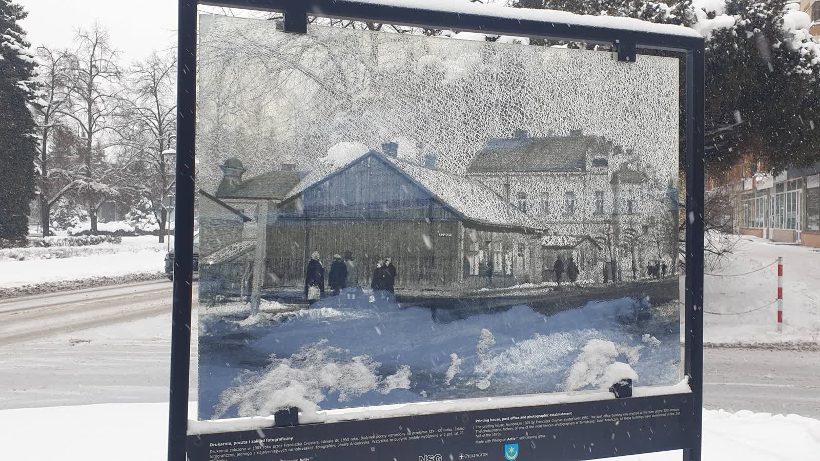 Uszkodzona tablica znajduje się przy ulicy Mickiewicza, w sąsiedztwie Urzędu Miasta. Przedstawia nieistniejące już budynki dawnej drukarni, poczty oraz zakładu fotograficznego, które zostały wyburzone w połowie lat siedemdziesiątych.