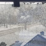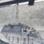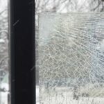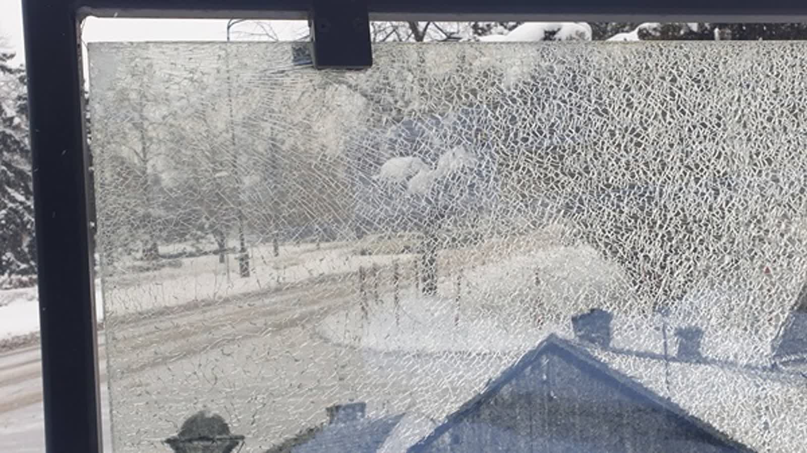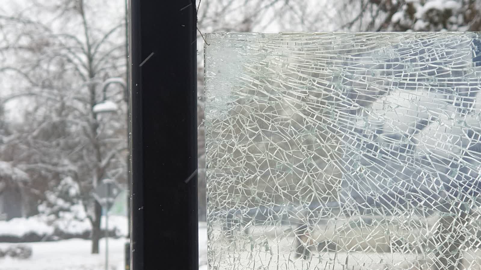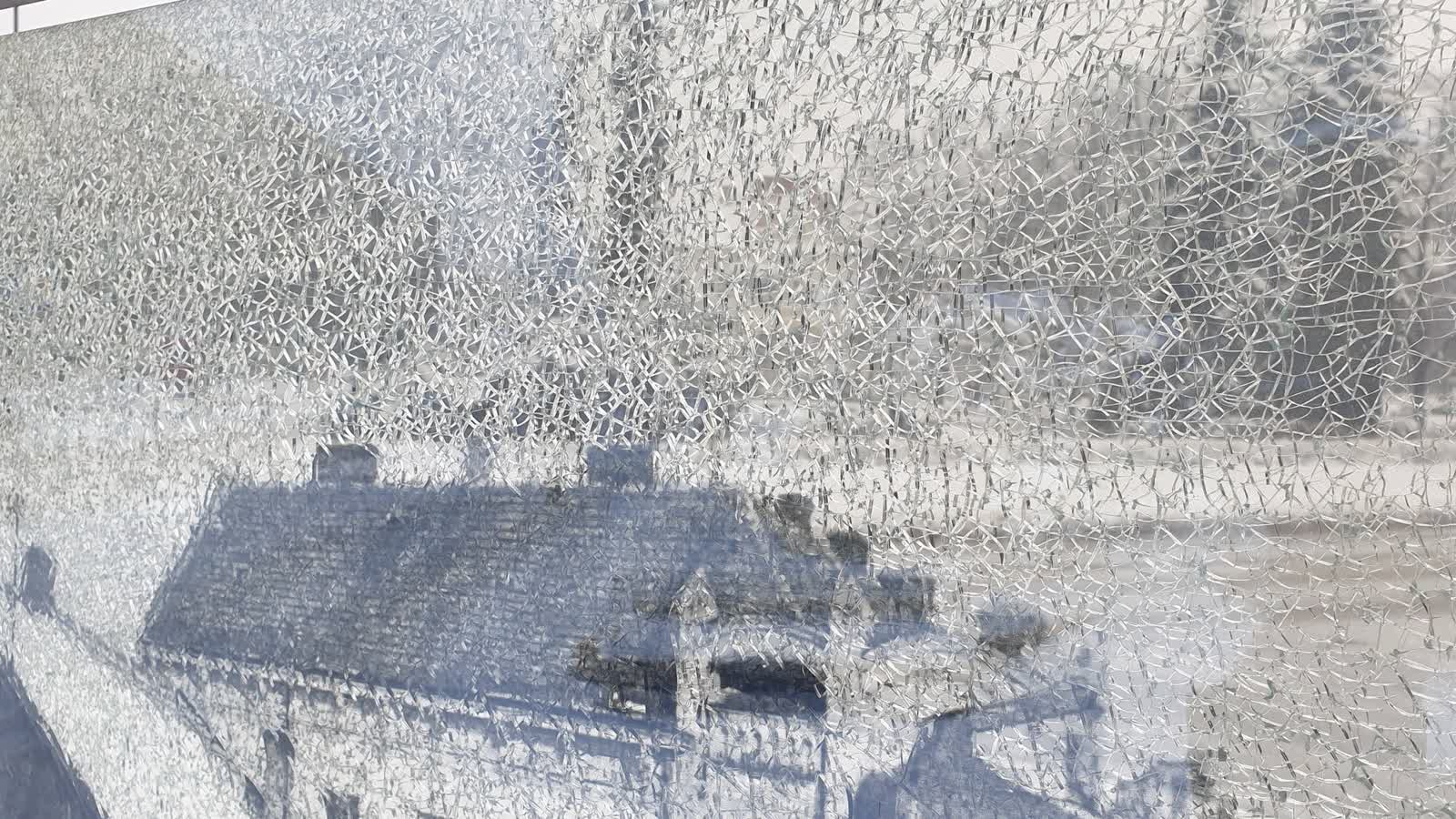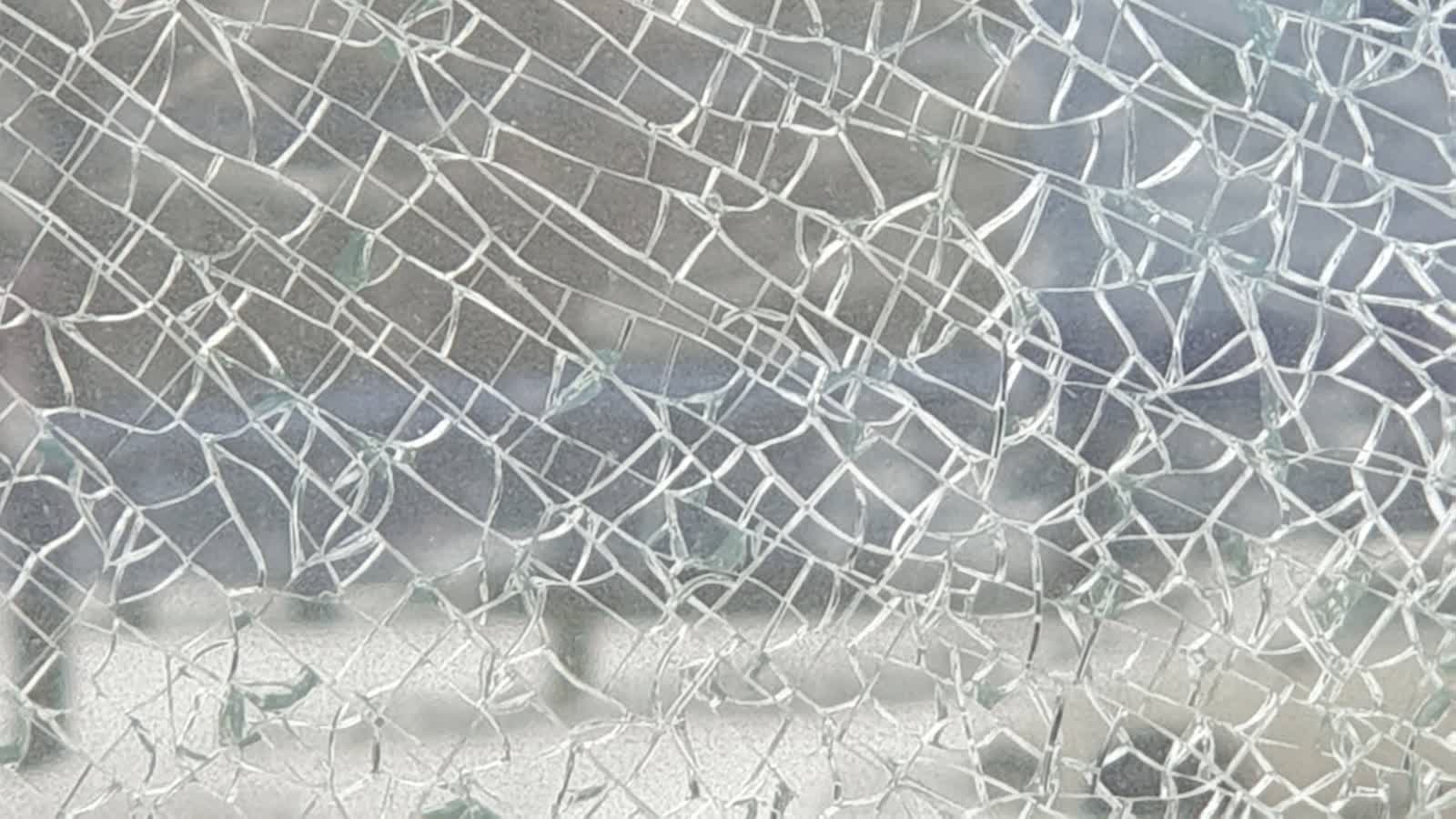 Na szklanej tafli, w lewym górnym rogu, widoczny jest punkt, w którym mogło dojść do jej naruszenia. Całe szkło jest popękane, co jest charakterystycznie dla szkła hartowanego.