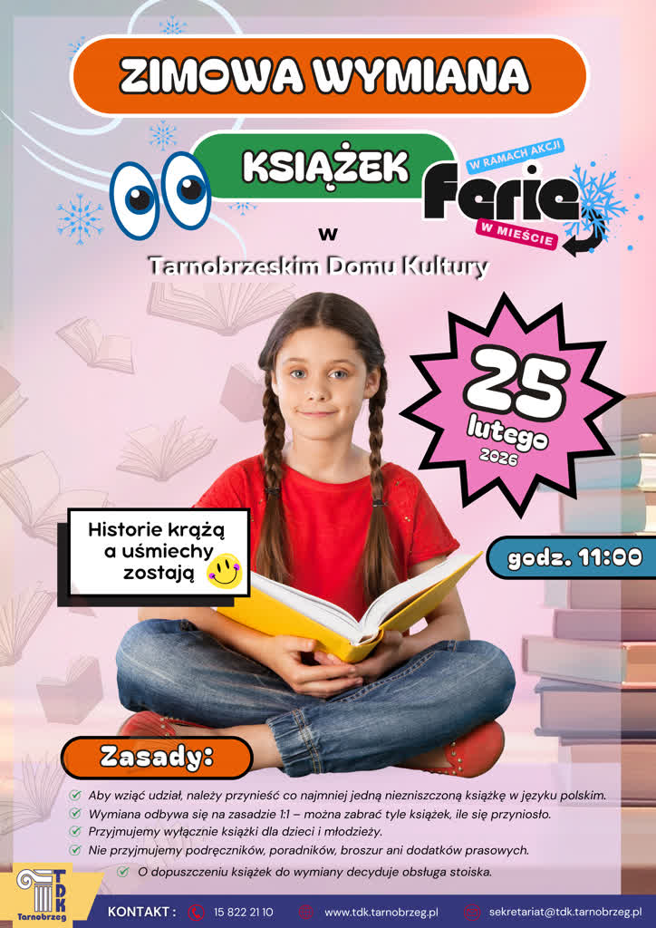 Jeżeli posiadasz w domu książkę w dobrym stanie, a jest Ci ona niepotrzebna, to przynieś ją 25 lutego 2026 r. do TDK i weź inną w zamian. Pamiętaj, że książka czytana żyje dłużej!