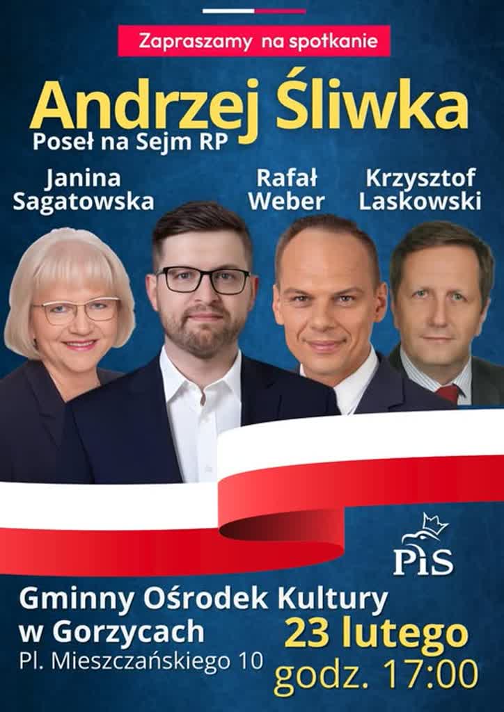 Poseł na Sejm RP Rafał Weber oraz Senator RP Janina Sagatowska zapraszają na spotkanie z Wiceministrem Aktywów Państwowych w Rządzie Prawa i Sprawiedliwości Andrzejem Śliwką, które odbędzie się dziś (poniedziałek, 23 lutego) w Gminnym Ośrodku Kultury w Gorzycach (Pl. Mieszczańskiego 10) o godzinie 17:00.