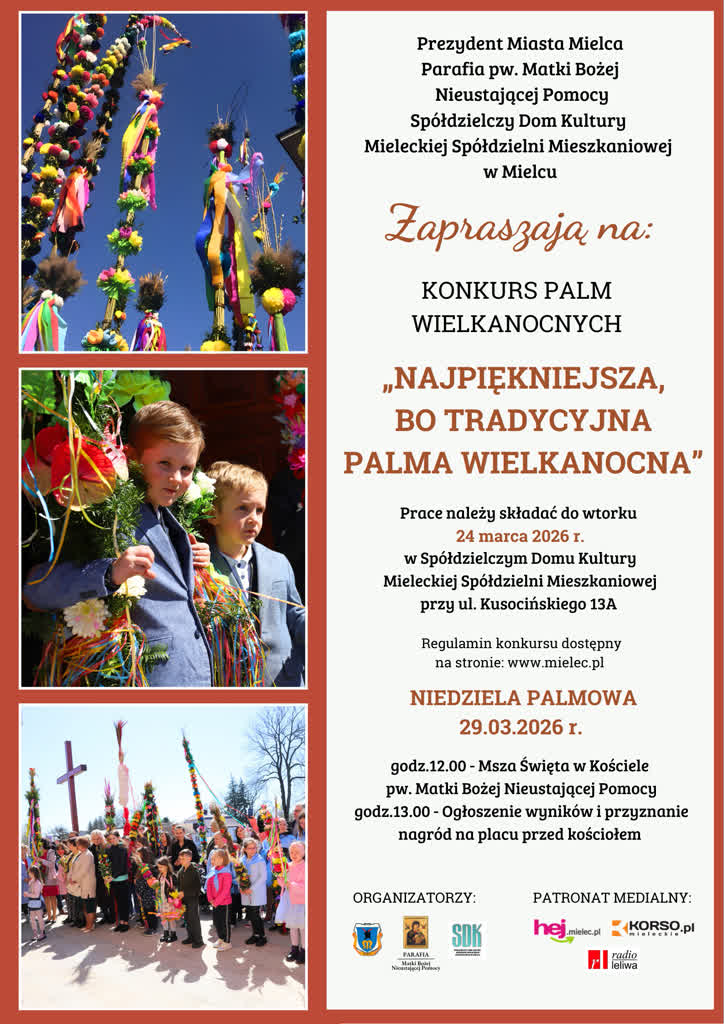 Prezydent Miasta Mielca, Parafia pw. Matki Bożej Nieustającej Pomocy oraz Spółdzielczy Dom Kultury w Mielcu zapraszają do udziału w konkursie zatytułowanym „Najpiękniejsza – bo tradycyjną palma wielkanocna”. Konkurs ten ma wieloletnią tradycję w Mielcu a pomysł na jego organizację w Mielcu zaczął się od Lipnicy Murowanej, tłumaczy Ewelina Sieroń kierownik Spółdzielczego Domu Kultury w Mielcu.