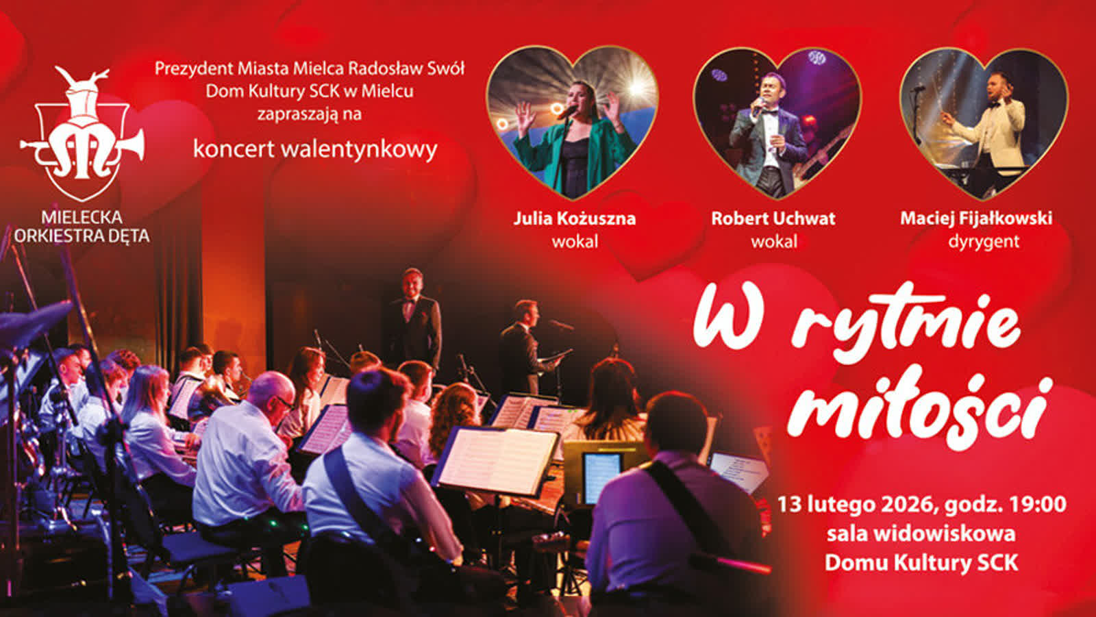 Na piątkowy Koncert Walentynkowy zatytułowany „W rytmie miłości” zaprasza do Domu Kultury w Mielcu, Mielecka Orkiestra Dęta wraz z solistami. Będzie to pełen emocji, romantycznych dźwięków i wyjątkowej atmosfery uczta muzyczna, która wszystkich zakochanych zabierze w wyjątkową muzyczną podróż przez ponadczasowe utwory legend polskiej i światowej sceny. Wśród występujących na scenie pojawi się także m.in. Julia Kożuszna.