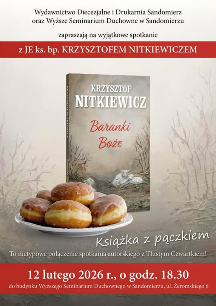 Spotkanie autorskie z biskupem Krzysztofem Nitkiewiczem promujące tę książkę odbędzie się w najbliższy czwartek (12 lutego) w Wyższym Seminarium Duchownym w Sandomierzu. Ponieważ tego dnia przypada tłusty czwartek, spotkaniu z literaturą towarzyszyć będzie akcent kulinarny w postaci pączków przygotowanych przez członkinie Koła Gospodyń Wiejskich w Chobrzanach słynących ze swoich karnawałowych wypieków. Początek spotkania o godzinie 18 30. Wstęp wolny.