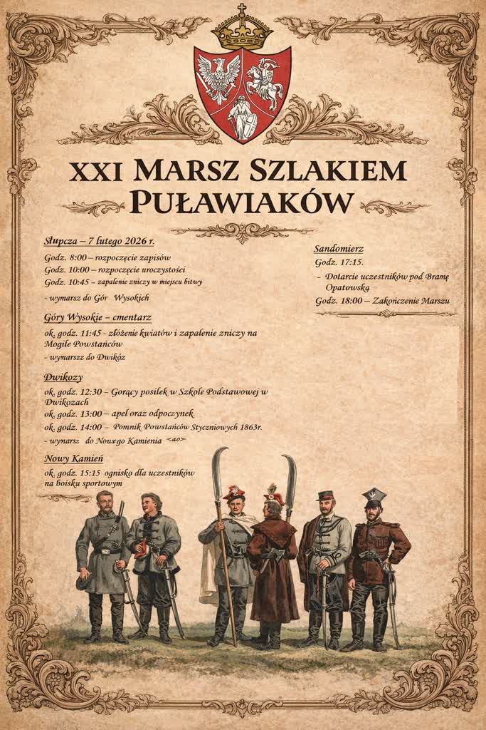 Po raz dwudziesty pierwszy odbędzie się Marsz Szlakiem Puławiaków Powstańców Styczniowych 1863 roku na trasie Słupcza-Dwikozy-Sandomierz. W najbliższą niedzielę 8 lutego uczestnicy wydarzenia upamiętnią bitwę pod Słupczą z 8 lutego 1863 roku, kiedy to zginęło 28 powstańców, głównie studentów Instytutu Politechnicznego w Puławach.
