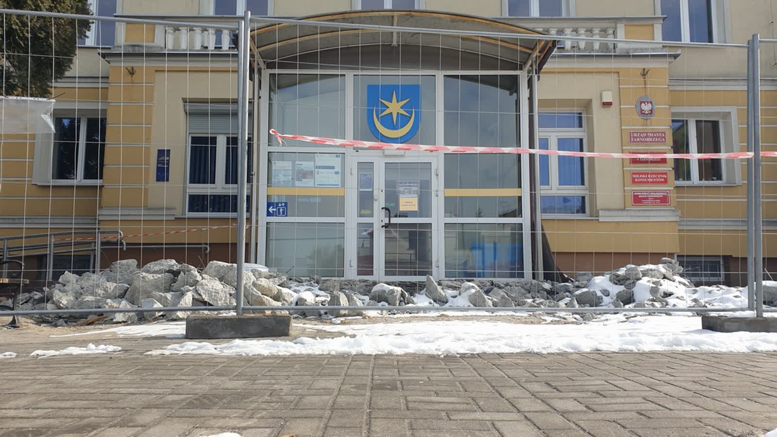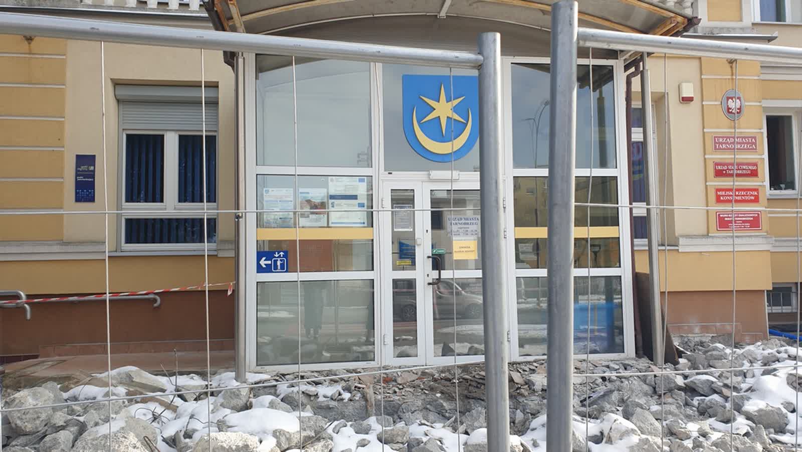 Teren przed głównym wejściem do budynku Urząd Miasta Tarnobrzega przy ulicy Mickiewicza jest obecnie rozkopany. Trwa przebudowa schodów prowadzących do urzędu.