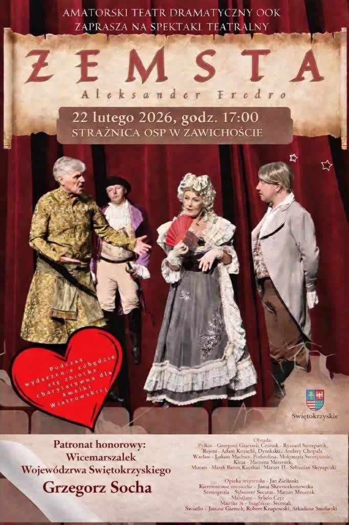 W najbliższą niedzielę (22 lutego) w zabytkowej strażnicy OSP w Zawichoście będzie można zobaczyć arcydzieło polskiej literatury w wykonaniu Amatorskiego Teatru Dramatycznego z Opatowa. To spektakl „Zemsta” Aleksandra Fredry.