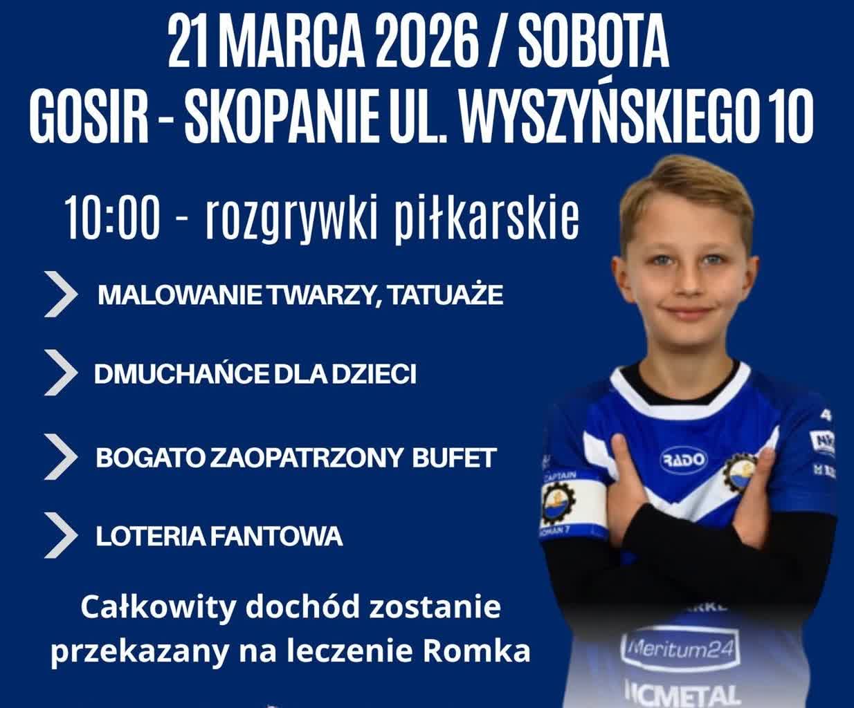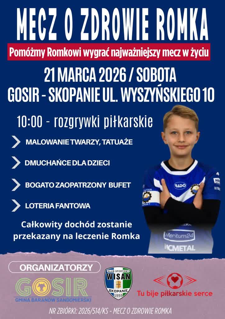 Charytatywny turniej piłkarski odbędzie się w najbliższą sobotę, 21 marca, w Skopaniu. Wydarzenie organizują wspólnie tamtejszy Gminny Ośrodek Sportu i Rekreacji, Klub Sportowy Wisan oraz serwis internetowy „Tu bije piłkarskie serce”. Cały dochód z turnieju zostanie przeznaczony na wsparcie leczenia 9-letniego Romka Żmudy z Mielca.