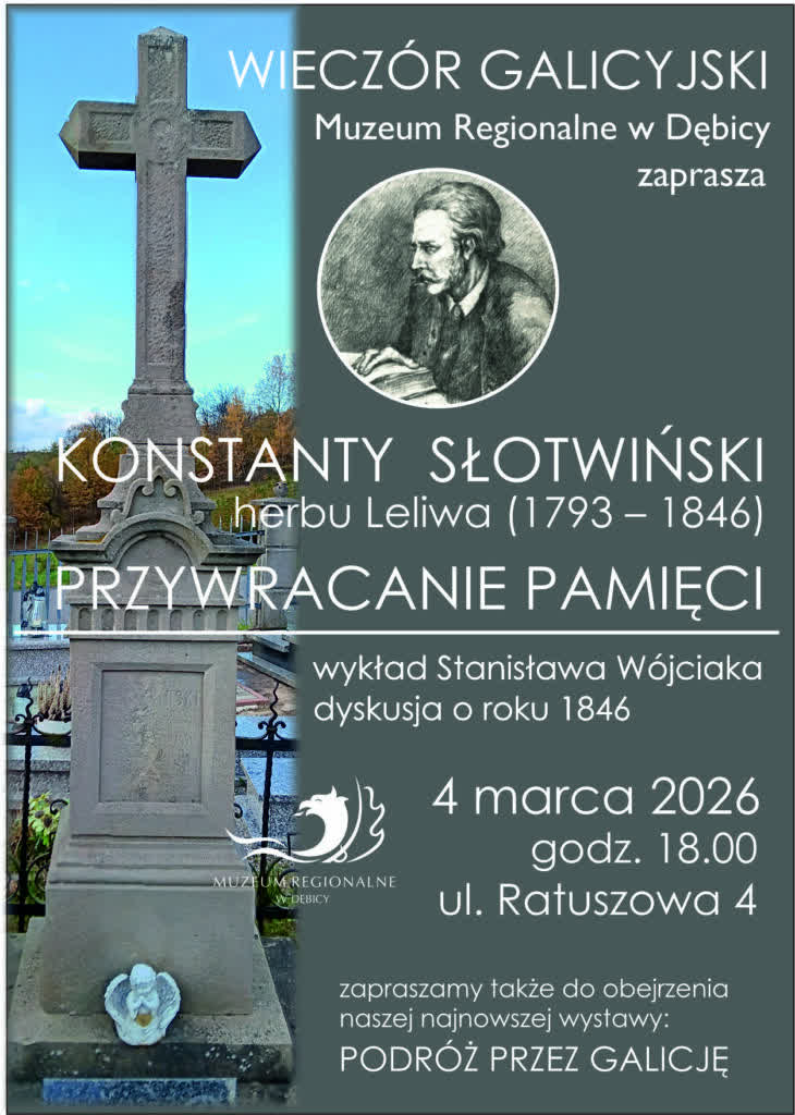 4 marca br. o godz. 18:00 w Muzeum Regionalnym w Dębicy zaplanowano Wieczór galicyjski, który przyjmie formę wykładu historycznego. Prelekcję wygłosi Stanisław Wójciak, podejmując temat dyskusji wokół wydarzeń z 1846 roku. Spotkanie zostanie dedykowane pamięci Konstantego Słotwińskiego herbu Leliwa.