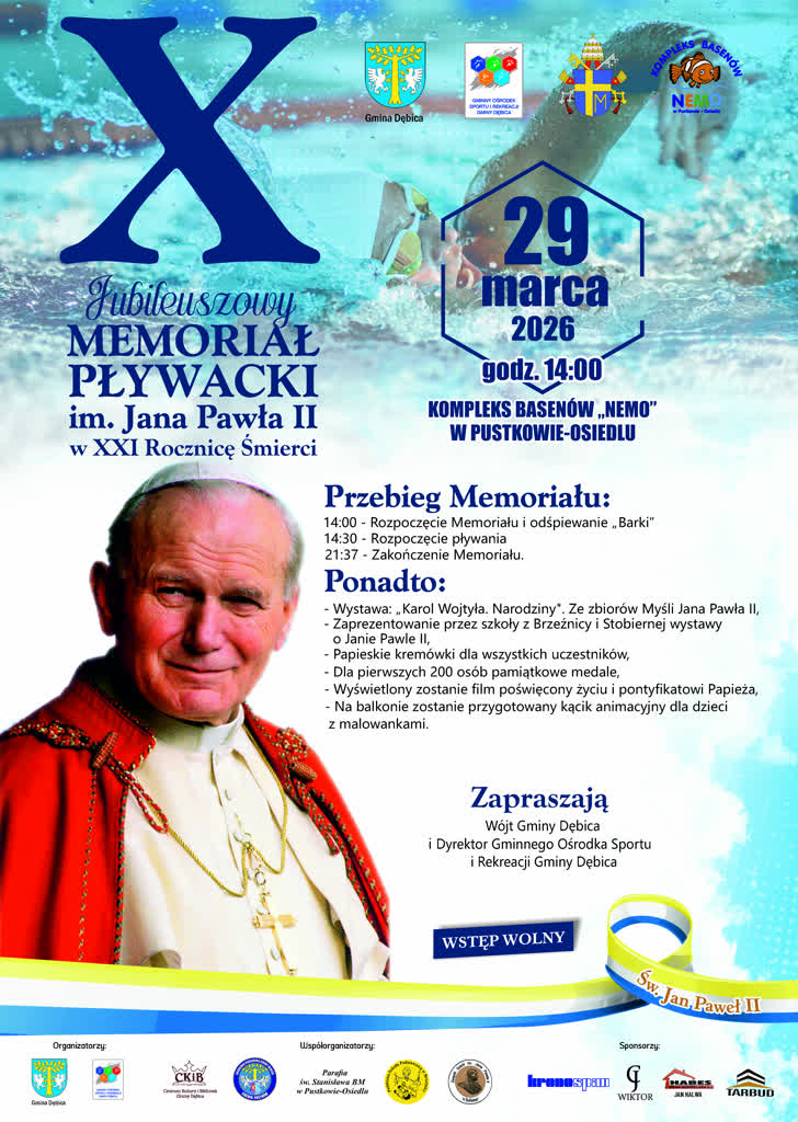 Już 29 marca na Kompleksie Basenów NEMO odbędzie się X Jubileuszowy Memoriał Pływacki im. Jana Pawła II, organizowany w XXI rocznicę śmierci Papieża Polaka. To wyjątkowe wydarzenie sportowo-patriotyczne łączące pamięć o wielkim Polaku z promocją aktywności fizycznej i integracją lokalnej społeczności.