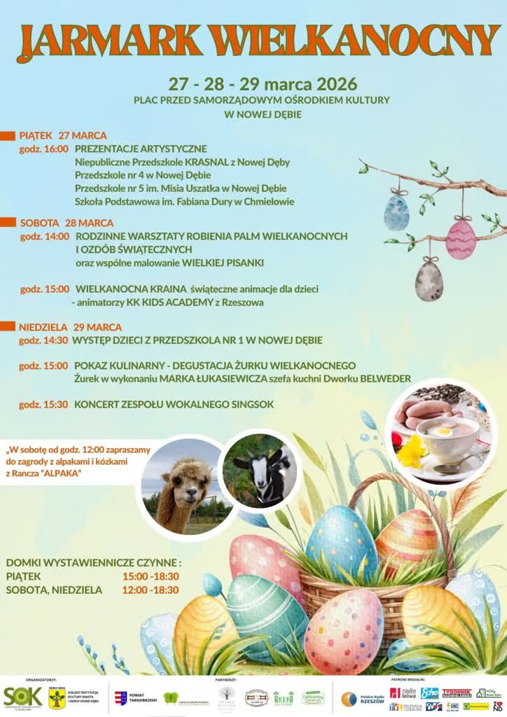 W Nowej Dębie jarmark przy Samorządowym Ośrodku Kultury potrwa w sumie 3 dni. Od piątku do niedzieli będzie można nabyć tu wszystko co potrzebne na wielkanocny stół. Dodatkowo organizatorzy przygotowali wiele atrakcji towarzyszących takich jak występy artystyczne dzieci i młodzieży, animacje czy zagrodę z alpakami.