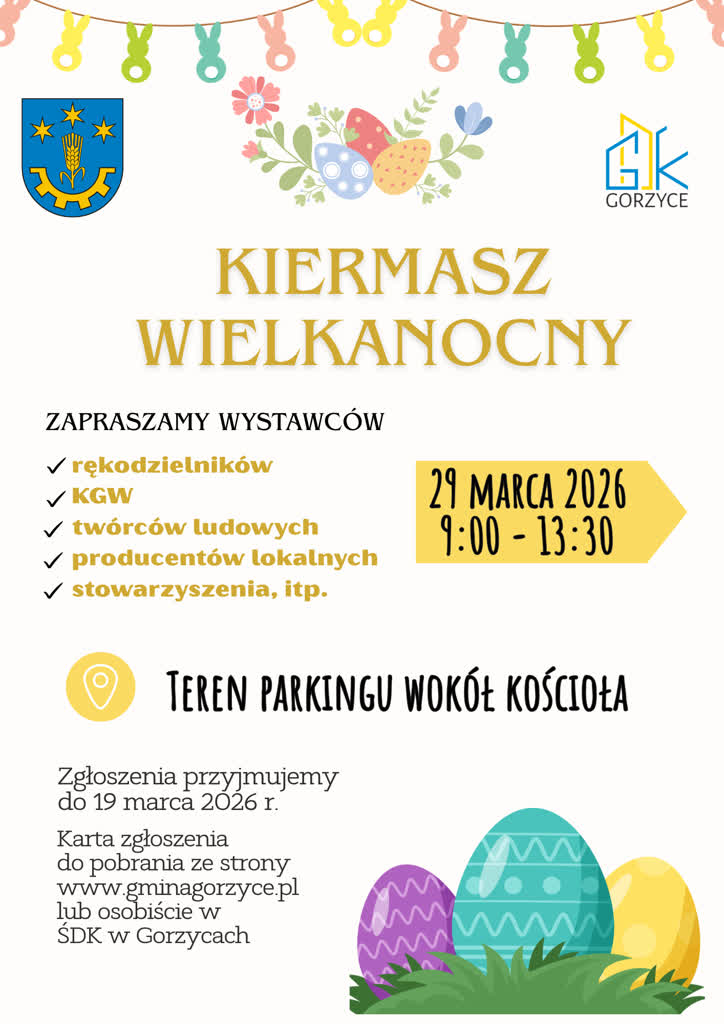 Również w niedzielę wielkanocny kiermasz odbędzie się w Gorzycach. Od godziny 9 do 13:30 na parkingu przed kościołem parafialnym obecne będą stoiska rękodzielników, twórców ludowych, kół gospodyń wiejskich i stowarzyszeń. Nie zabraknie wielkanocnych ozdób i przysmaków.