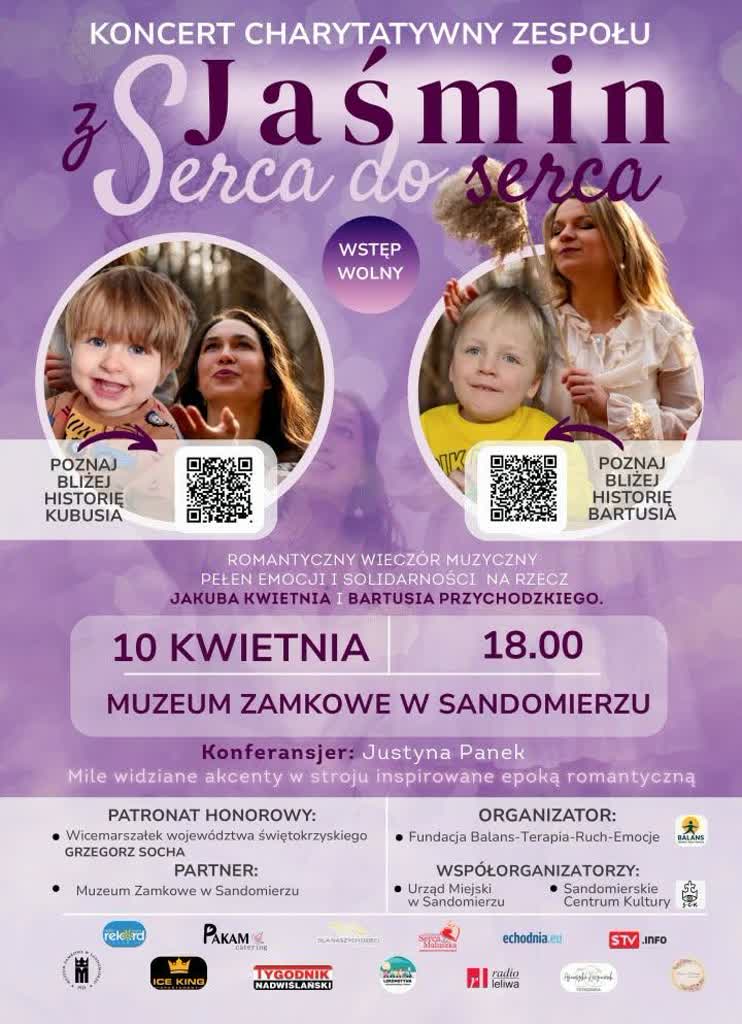 10 kwietnia o godzinie 18.00 w Muzeum Zamkowym w Sandomierzu odbędzie się koncert charytatywny zespołu Jaśmin „Z serca do serca” na rzecz dwóch młodych Sandomierzan – Jakuba Kwietnia oraz Bartłomieja Przychodzkiego.
