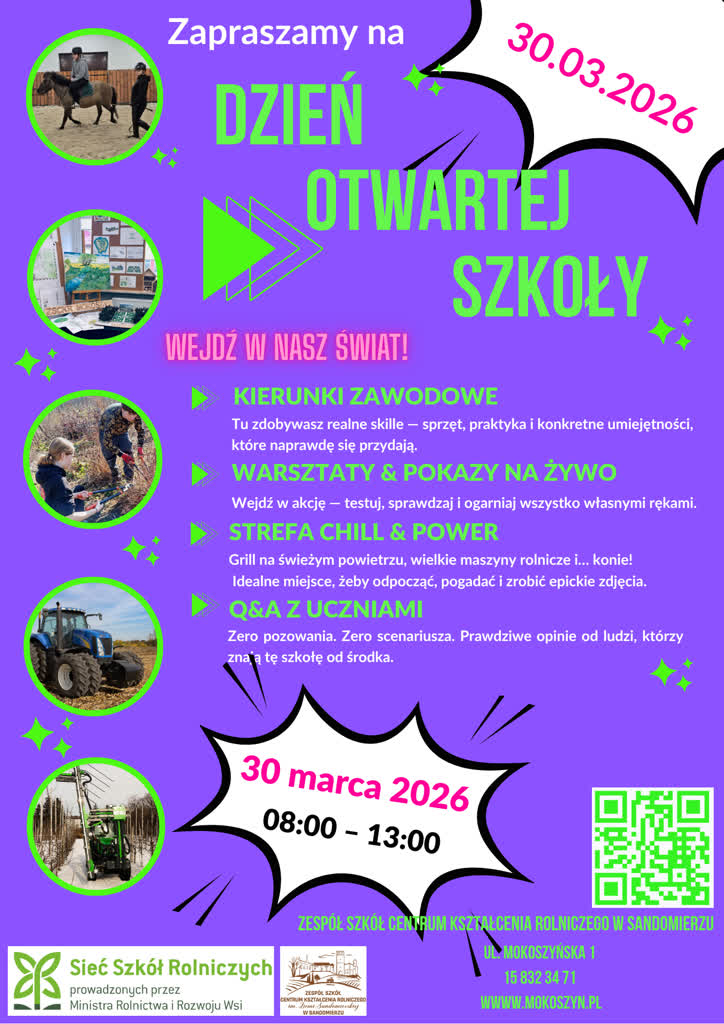 Kiermasz odbędzie się w godzinach 8:00-13:00. Poniedziałek to także dzień otwarty. Wszyscy zainteresowani będą mogli zapoznać się z życiem i specyfiką szkoły oraz możliwościami, jakie daje nauka w sandomierskim „Rolniku”.