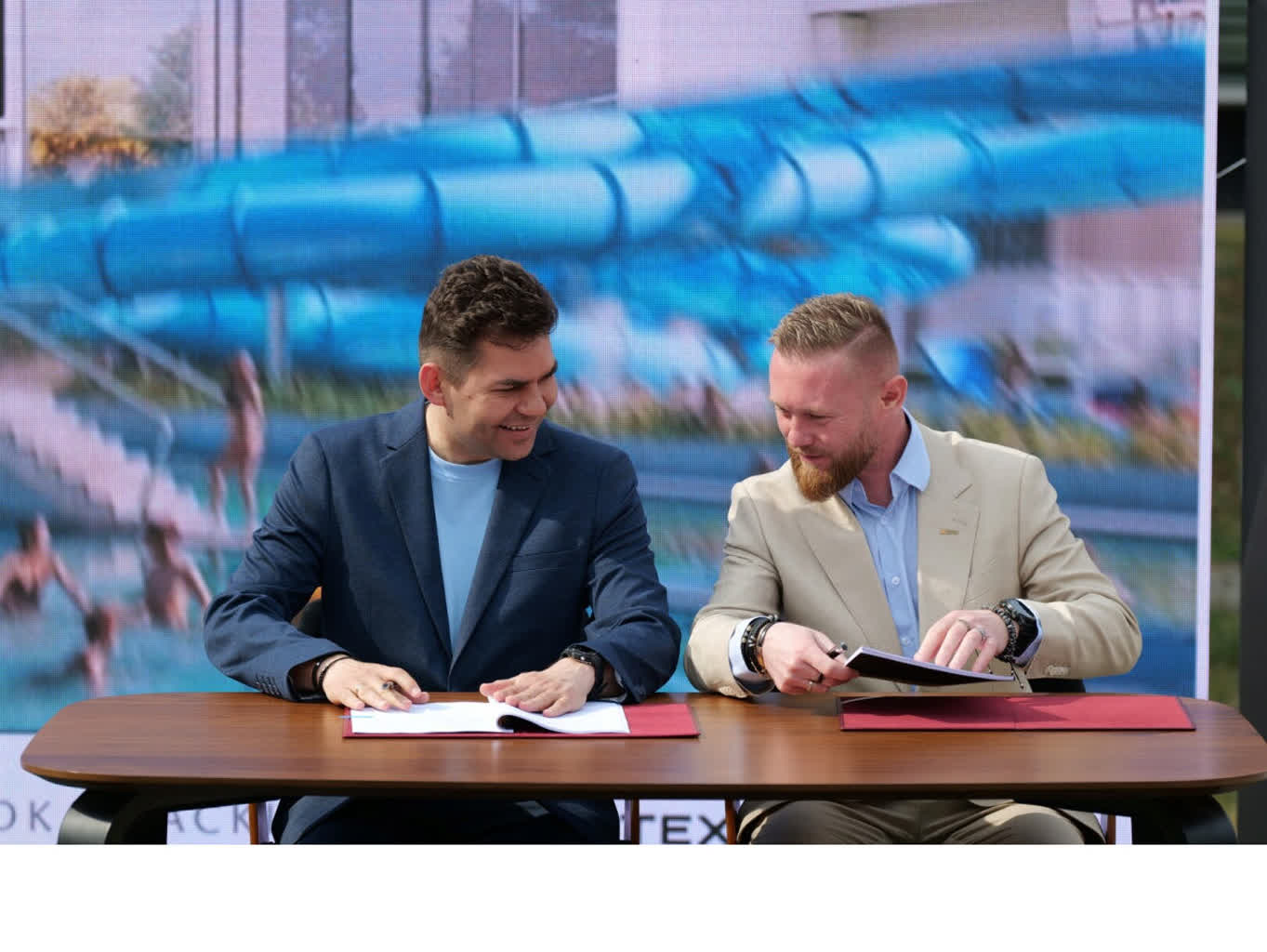 Umowa z wykonawcą budowa tego obiektu sportowo-rekreacyjnego została podpisana w świetle fleszy podczas konferencji zorganizowanej w miejscu gdzie powstanie aquapark.
