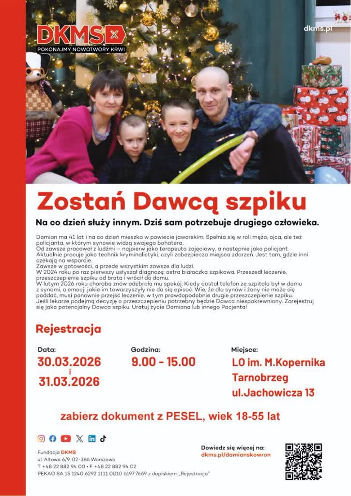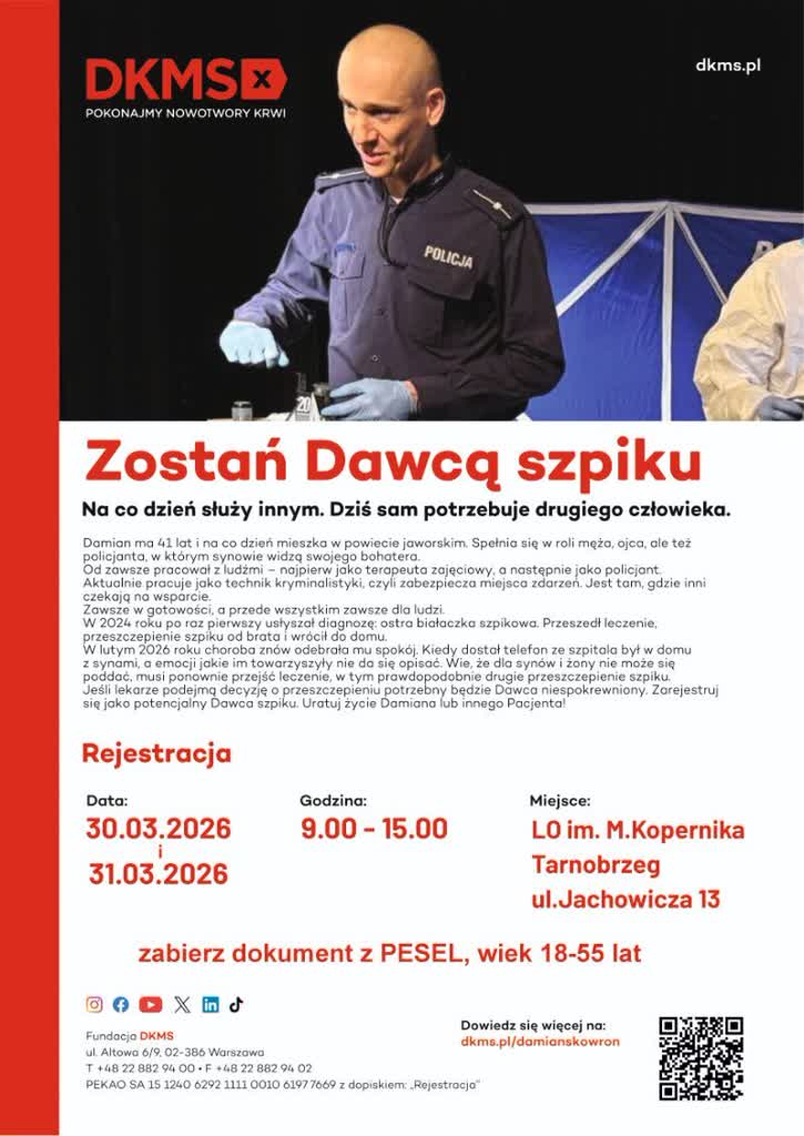 Akcja organizowana we współpracy z Fundacją DKMS ma szczególny wymiar. Towarzyszy jej apel o pomoc dla 41-letniego policjanta Damiana, który na co dzień pomaga innym, a dziś sam potrzebuje wsparcia. Mężczyzna choruje na ostrą białaczkę szpikową i jego szansą na powrót do zdrowia jest przeszczep szpiku od niespokrewnionego dawcy.