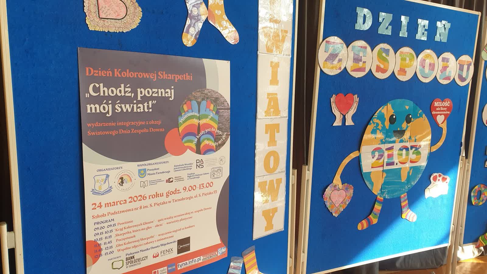 Wydarzenie w ramach projektu „Chodź, poznaj mój świat”, czyli Dzień Kolorowej Skarpetki trwa w Szkole Podstawowej numer 8 na osiedlu Wielowieś w Tarnobrzegu. Spotkanie zorganizowano z okazji przypadającego 21 marca Światowego Dnia Zespołu Downa. Ma ono na celu integrację dzieci pełnosprawnych oraz z niepełnosprawnościami, a także dzieci z okolicznych domów dziecka. Innym celem jest budowanie empatii i świadomości społecznej.