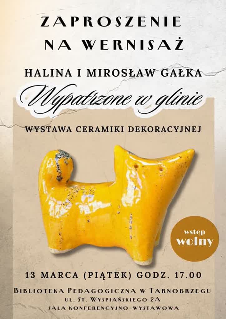 W Tarnobrzegu odbędzie się wernisaż wystawy ceramiki dekoracyjnej autorstwa Haliny i Mirosława Gałków. Ekspozycja zatytułowana „Wypatrzone w glinie” prezentuje autorskie prace ceramiczne inspirowane formami natury i wyobraźnią artystów.