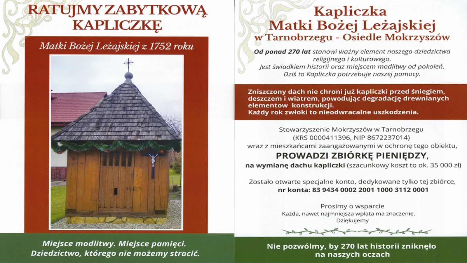 Zabytkowa kapliczka Matki Bożej Leżajskiej na tarnobrzeskim osiedlu Mokrzyszów wymaga pilnej renowacji. Drewniany obiekt z 1752 roku od ponad 270 lat stanowi ważny element lokalnego dziedzictwa religijnego i kulturowego oraz miejsce modlitwy kolejnych pokoleń mieszkańców.