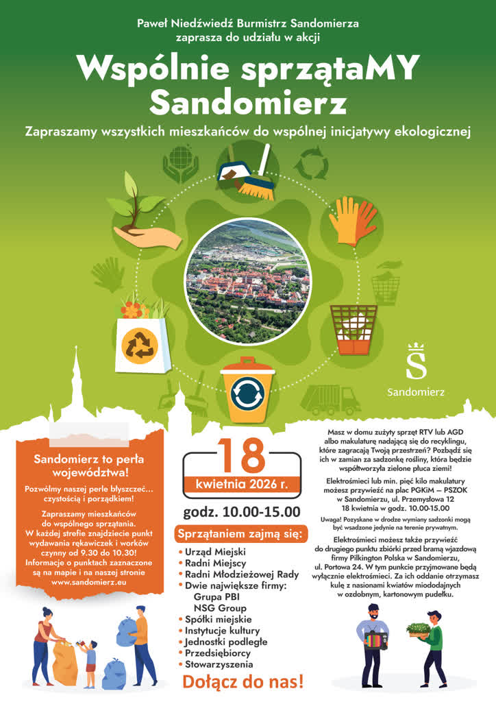 Po raz kolejny odbędzie się akcja „Wspólnie sprzątaMY Sandomierz”. Sprzątaniu miasta towarzyszyć będzie także proekologiczna akcja zbiórki elektrośmieci i makulatury w zamian za sadzonki roślin.