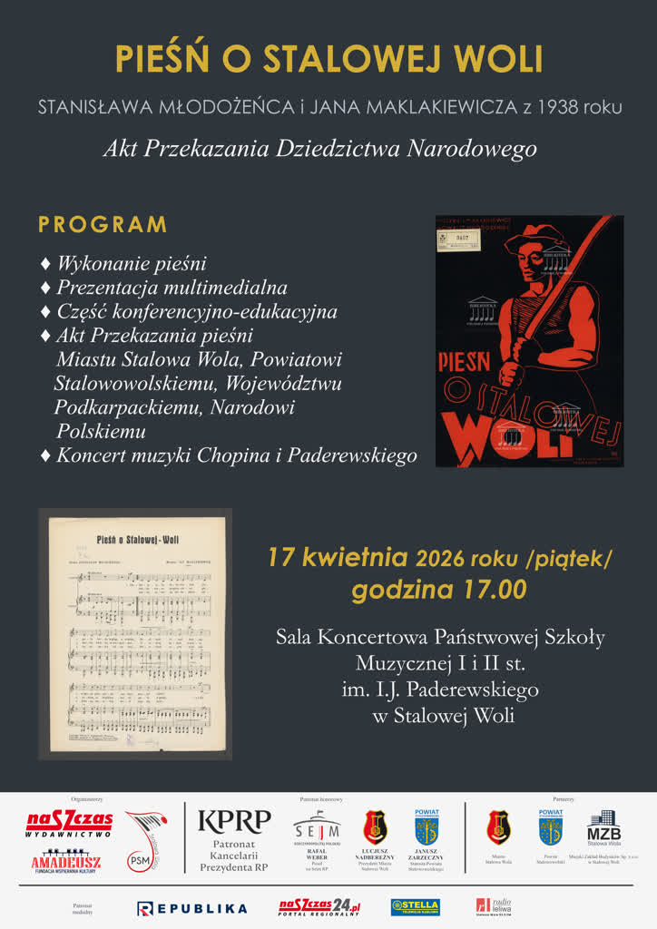Uroczystość pod nazwą „Pieśń o Stalowej Woli – Akt Przekazania Dziedzictwa Narodowego” odbędzie się 17 kwietnia 2026 roku o godz. 17.00 w sali koncertowej Państwowej Szkoły Muzycznej I i II stopnia im. Ignacego Jana Paderewskiego w Stalowej Woli.