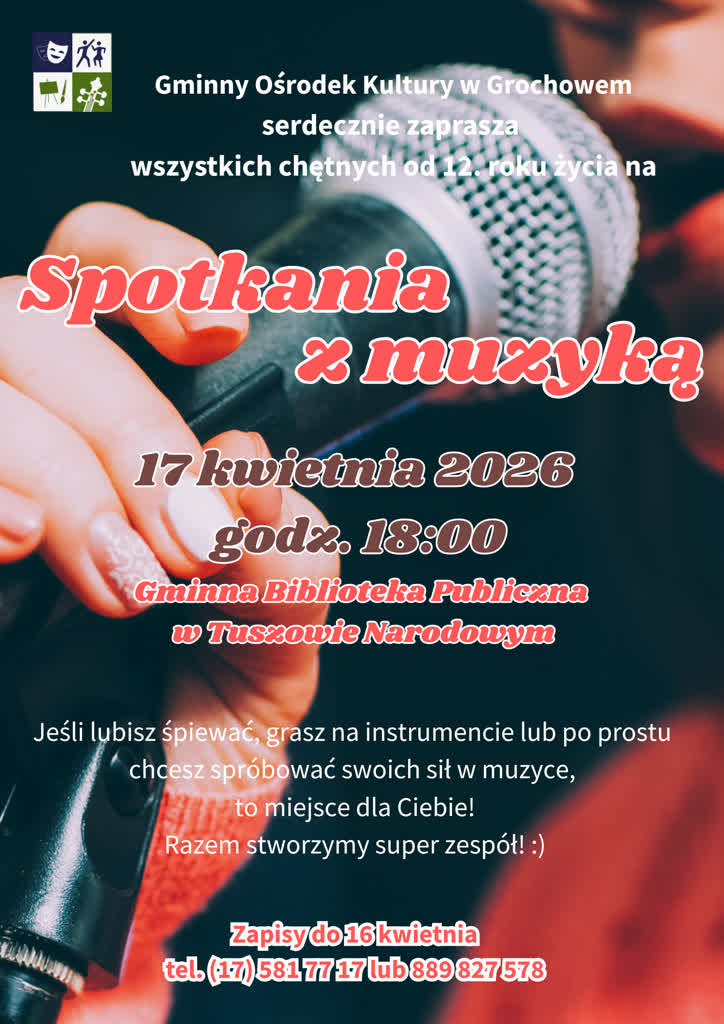 Gminny Ośrodek Kultury w Grochowem zaprasza mieszkańców do udziału w nowym projekcie „Spotkania z muzyką”. Spotkanie organizacyjne odbędzie się 17 kwietnia 2026 r. o godz. 18:00 w Gminnej Bibliotece Publicznej w Tuszowie Narodowym. Inicjatywa skierowana jest do osób od 12. roku życia – zarówno śpiewających i grających na instrumentach, jak i tych, którzy chcą rozpocząć swoją przygodę z muzyką.