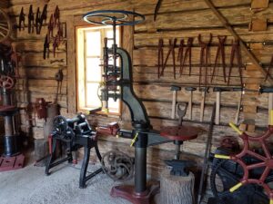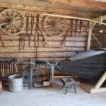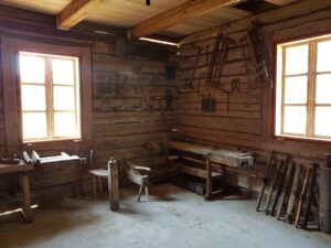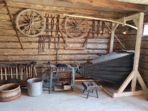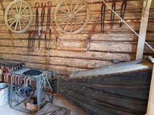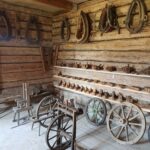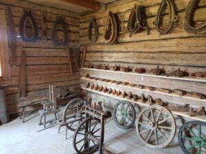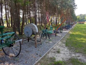 Oprócz kilkudziesięciu  konnych maszyn rolniczych różnego typu, na dużej przestrzeni zgromadzono więcej eksponatów. W jednym z budynków można podziwiać 150 żelazek z duszą, zakład szewski,  w innym zaś – drewnianej chacie –  zobaczymy zakład stolarski i kuźnię.