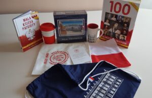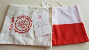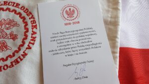 -duża biało-czerwona flaga w lnianym pokrowcu z wyhaftowanym napisem „stulecie odzyskania niepodległości” i dołączoną kartką pamiątkową z adnotacją i podpisem prezydenta RP Andrzeja Dudy.