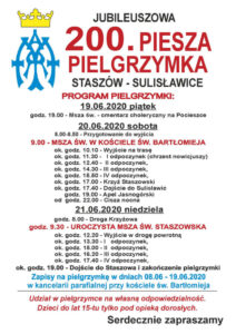 W piątek (19.06) o godzinie 19 00 odprawiona zostanie msza święta na cmentarzu cholerycznym na Pocieszce. Pielgrzymi wyruszą na szlak w sobotę około godziny 10 00 po mszy zaplanowanej na godzinę 9 00 w kościele św. Bartłomieja. W niedzielę zaś w sanktuarium Sulisławicach o 9 30 odbędzie się msza święta staszowska, po której pątnicy wyruszą w drogę powrotną.