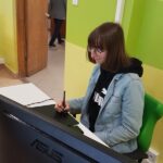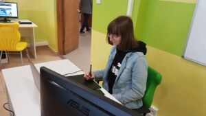 Iwona Biernat uczennica klasy IV technikum grafiki i poligrafii cyfrowej wybrała ten kierunek bo jest przyszłościowy. Dziś podczas prezentacji pracowni można było na obrazie z rzutnika obserwować jak tworzy rysunki w programie zainstalowanym w nowym komputerze.